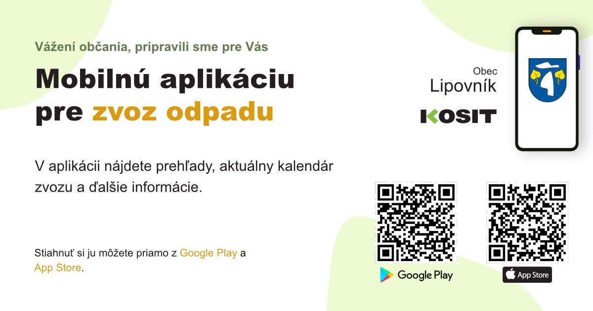 Vážení občania, spoločnosť Kosit a.s. pripravil pre Vás Mobilnú aplikáciu pre zvoz odpadu. V aplikácií nájdete prehľady, aktuálny kalendár zvozu a ďalšie informácie.